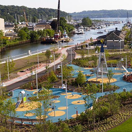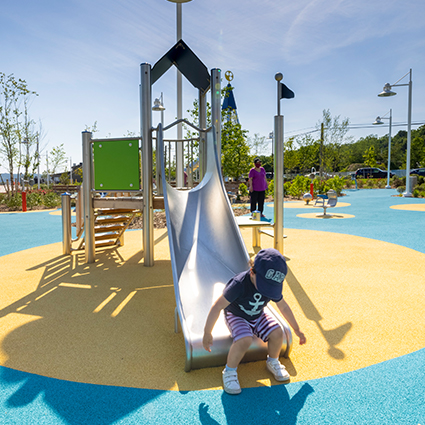 An den Ufern der Hempstead Bay auf Long Island, auf einer ehemaligen Industriebrache, ist ein neues Viertel entstanden. Entlang eines Meeresarms gelegen und durch eine Uferpromenade verbunden, sind die Geschäfte, Restaurants und Spielplätze von Garvies Point bereits ein beliebtes Ziel für die Bewohner von Glen Cove, NY. Einer der auffälligsten Punkte ist der Spielplatz mit dem unverwechselbaren Dalbenturm. Nur wenige Wochen nach der Einweihung ist der Park bereits zum Liebling von Kindern und Familien geworden. „Wir wollten ein sehr bedeutendes vertikales Element, das man von anderen Bereichen des Geländes aus sehen kann und das die Kinder dorthin locken würde“, erklärt Parisi, Geschäftsführer von MPFP und der leitende Designer des Garvies Point-Projekts. „Wir wollten den Spielplatz nicht verstecken. „Der Spielplatz liegt direkt an einer großen Rasenfläche und blickt über die angrenzende Promenade hinaus auf den Glen Cove Creek. Dahinter liegt ein Wald. Die Ansammlung von Wohnhäusern in der Gegend vermitteln das Gefühl eines Dorfes. Der Garvies Point Playground, Teil der geplanten Entwicklung von Garvies Point, war immer als etwas Einzigartiges gedacht. „Wir wollten etwas anderes machen“, erinnert sich Parisi. Das Designteam wollte keinen weiteren typischen städtischen Spielplatz mit seiner vorhersehbaren Ansammlung von Schaukeln, Rutschen und Kletterstangen. „Wir haben uns bei europäischen Herstellern gezielt nach etwas umgesehen, das wie ein Turm aussieht, das sich origineller anfühlt … Das war unser Ziel.“ Das Team fand nicht nur genau den richtigen Turm, sondern entdeckte auch eine Vielzahl kreativ gestalteter Geräte, die ihre Vision für den Spielplatz verwirklichten. In Zusammenarbeit mit Goric Playgrounds zur Anpassung und Erstellung der technischen Spezifikationen wählte das Team die Komponenten aus, entschied über die Anordnung und erstellte Arbeitspläne und Renderings, wie der Platz nach dem Bau aussehen würde. „Goric ist einer der besten Distributoren, mit denen ich je zusammengearbeitet habe“, sagte Shawn Partin, der die Entwicklung des Spielplatzes leitete. „Sie waren nicht nur sehr sachkundig und lieferten alles, was ich wollte, sie lieferten alle Details und CAD, sie lieferten 3D, sie lieferten alle Schnittteile. Sie halfen mir zu verstehen, welche Teile des Produkts ich mit verschiedenen Farben anpassen kann, damit ich die Ästhetik erreichen kann, die MPFP und Garvies anstrebten.“ Die Details genau richtig hinzubekommen, war für das Garvies Point Projekt noch kritischer als für viele andere, ähnliche Entwicklungen. Bereits in den 1980er Jahren hatten die Verantwortlichen der Stadt die Absicht, das ehemalige Industriegelände neu zu entwickeln. Jahre der Sanierung machten die Gemeinde misstrauisch, ganz zu schweigen von einem weiteren Vorschlag, als RXR Realty 2014 die Planungsgenehmigung erhielt. Es sollte noch ein paar Jahre länger dauern, bis die rechtlichen Herausforderungen geklärt waren und endlich der erste Spatenstich für das 1,3 Milliarden Dollar teure Mischnutzungsprojekt erfolgen konnte. Goric und Kaiser & Kühne „entwarfen Konzeptionen, die einigen der Türme und Spielgeräte, die wir vor Jahren entworfen hatten, sehr ähnlich waren“, beobachtete Parisi. „Und wir konnten sie im Grunde bereits konform mit den Regierungsstandards bekommen. Sie entsprachen den Richtlinien, erfüllten die Anforderungen, und wir mussten keine Spezialanbieter beauftragen, sie zu bauen.“ „Wir hatten allen Leuten (in der Gemeinde und den am Projekt Beteiligten) und den Mitgliedern des Planungsausschusses immer gesagt, dass dieser Spielplatz etwas Besonderes sein würde“, sagt er. „Das war es, was uns zu Goric und Kaiser & Kühne geführt hat.“ Die Vorbereitung der Präsentation des Spielplatzes vor der Gemeinde und dem Planungsausschuss war aufgrund der Geschichte des Projekts und der Versprechungen, die das Planungsteam der Öffentlichkeit und sich selbst gegenüber machte, besonders kritisch. Als es an der Zeit war, die Bauunterlagen zu erstellen, war Goric zur Stelle. Partin, der 2015 Teil des MPFP-Teams wurde, als er in die Firma eintrat, sagt, dass Goric eng in den Bau des Spielplatzes eingebunden war und die Genehmigungen beschleunigte. An einem sonnigen, warmen Maitag letzten Monat wurde der Garvies Point Spielplatz eingeweiht. Eltern und Kinder – viele Kinder – der Bauunternehmer, Mitglieder des Stadtrats, der Bürgermeister und andere versammelten sich zum feierlichen Durchschneiden des roten Bandes. Innerhalb weniger Minuten balancierten die Kinder, drehten sich im Mondkreisel und vor allem kletterten sie auf den Dalbenturm, um die Tunnelrutsche hinunter zu rutschen. Der Turm und seine magische Rutsche sind zum Markenzeichen des gesamten Spielplatzes geworden. Und das ist genau das, was Parisi und sein Team wollten. „Das ist es, was uns angetrieben hat, ja, genau. Wir waren auf unserem eigenen Turm.“ Geschrieben und veröffentlicht von: Goric Marketing Group USA, Inc. https://goric.com/gorics-towering-pyramid-gives-garvies-point-a-signature-playground/